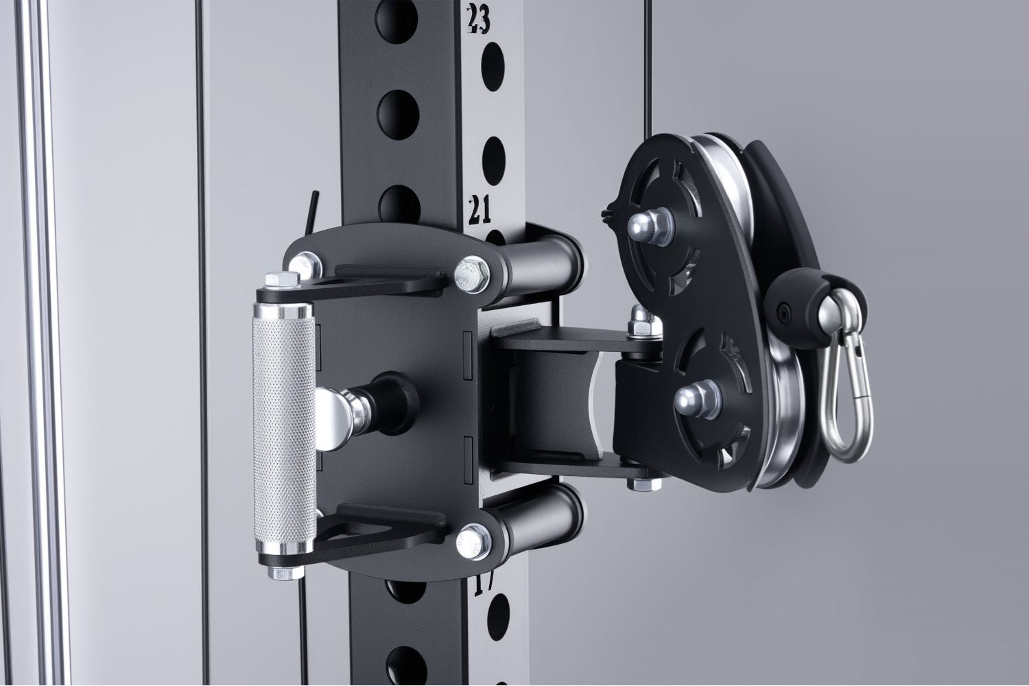 The cable trolley rides on ball bearings and uses a knurled handle instead of a plain steel rod, so every adjustment feels locked-in yet effortless.