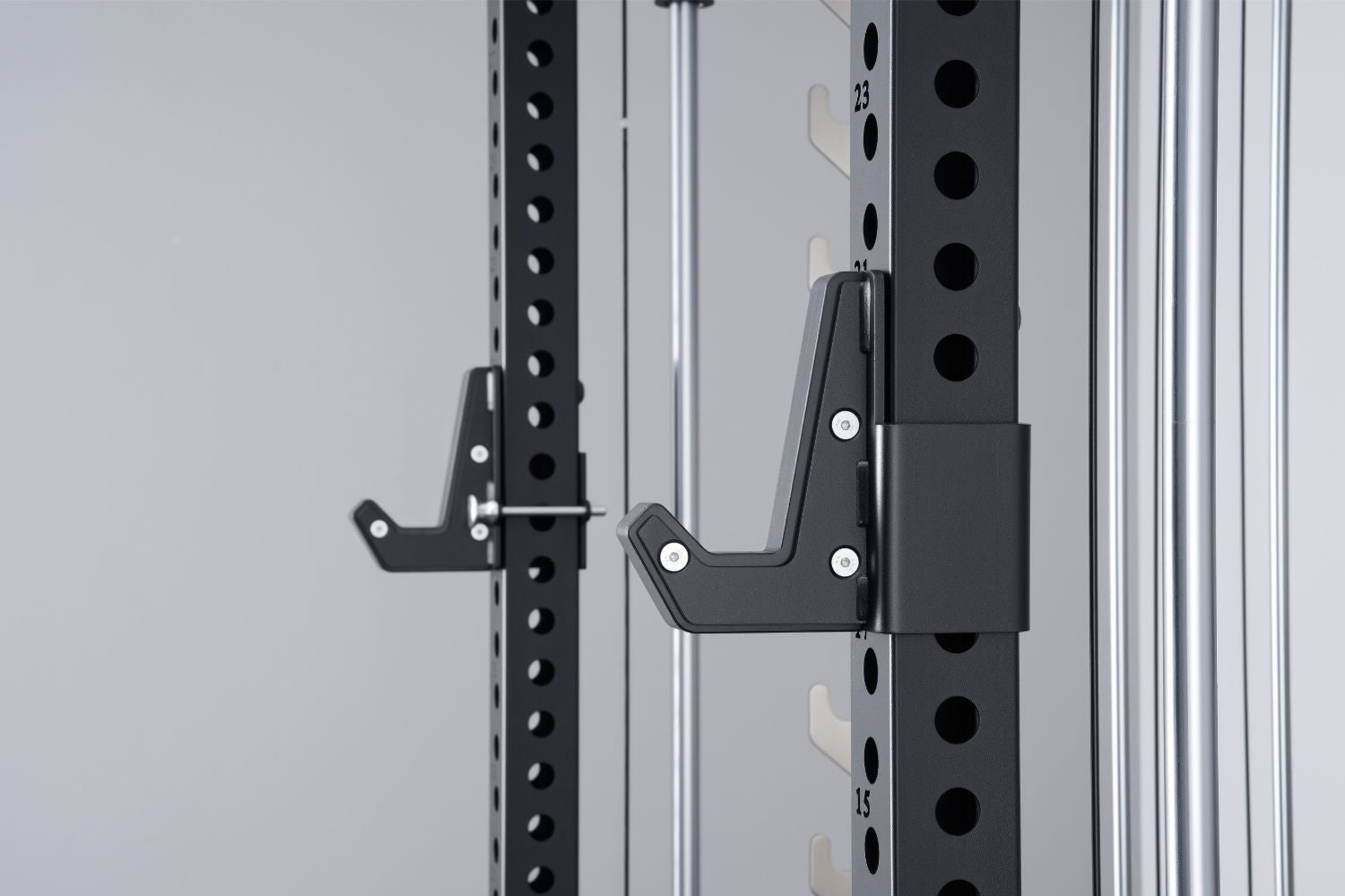 The rear attachment crossbeam provides dedicated storage for spotter arms and J-hooks when not in use. By keeping your gear off the floor, it ensures a safer, cleaner training space and quicker access to your attachments.