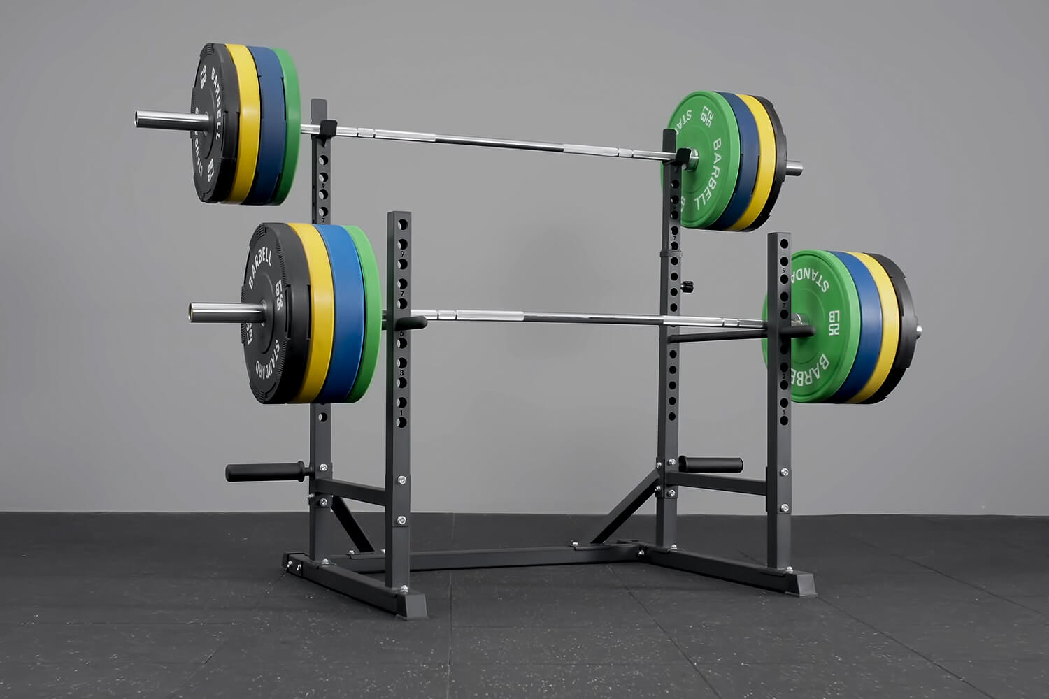 This rack functions as a standalone squat station and can be paired with a utility bench for flat and incline bench presses, offering a versatile range of exercise options.