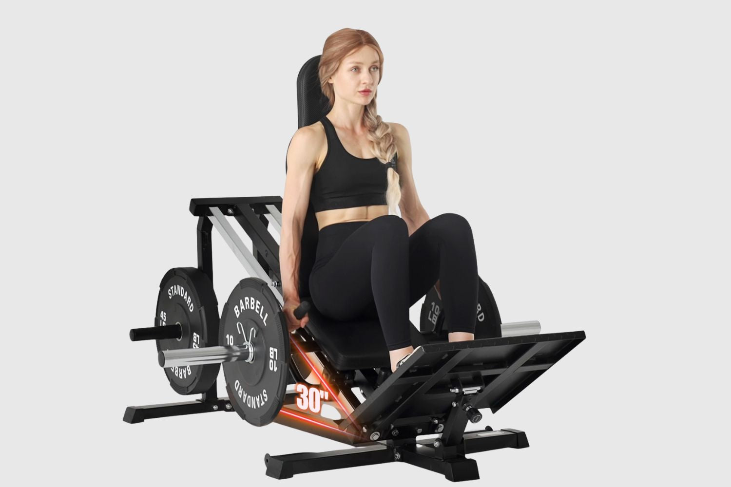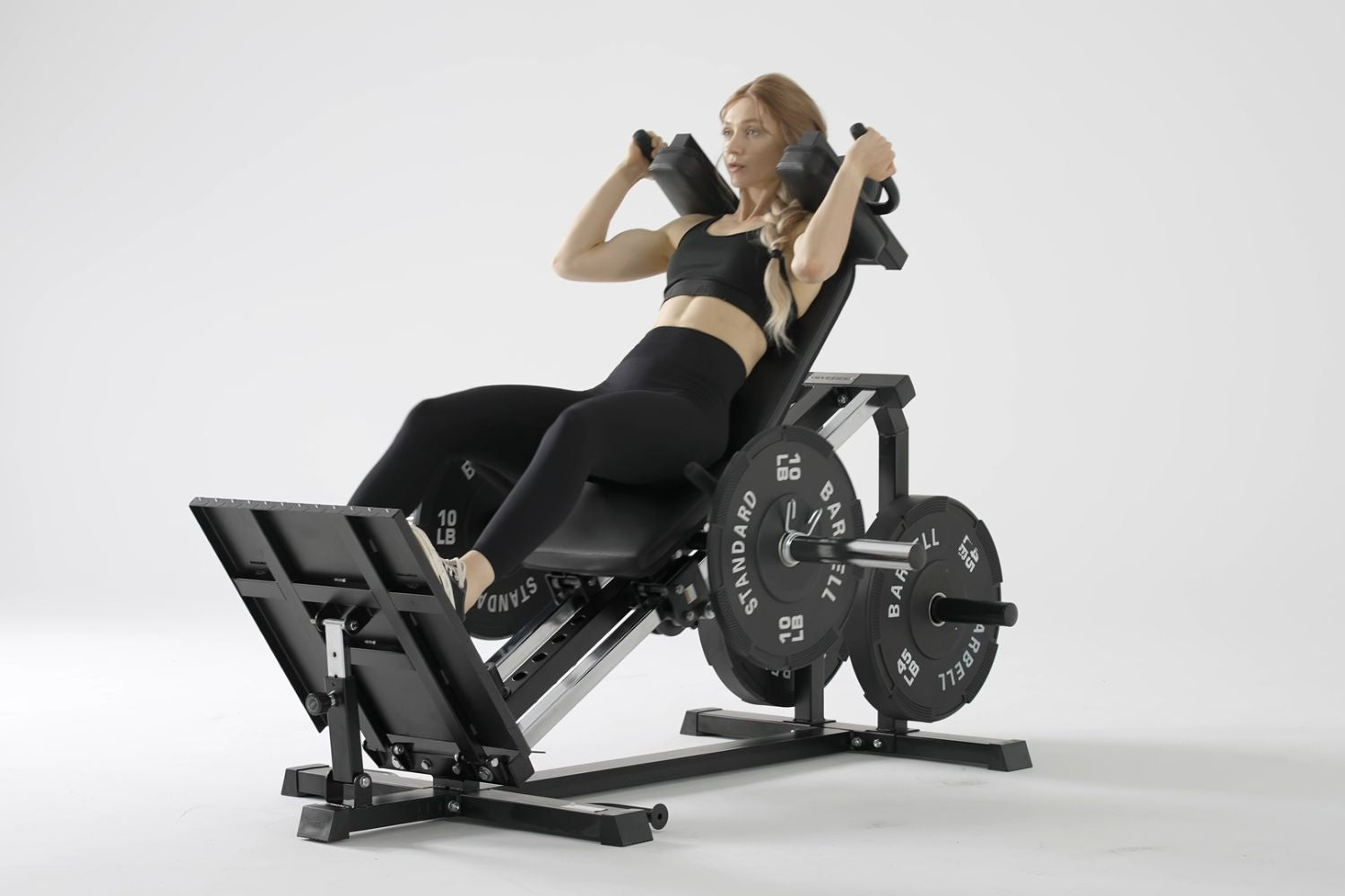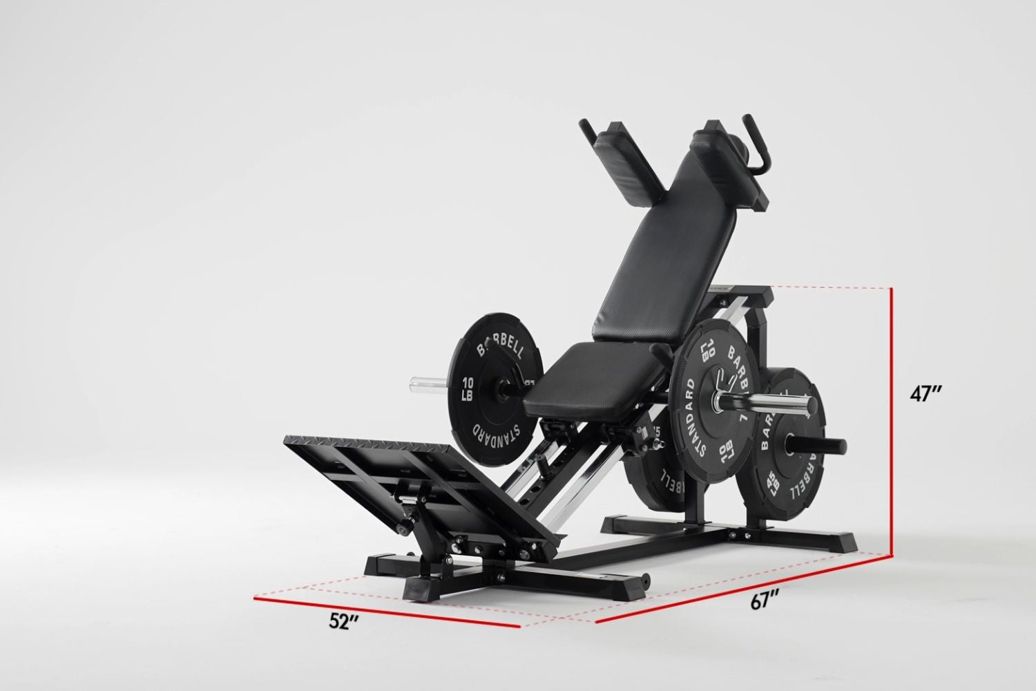 Perfect for home and garage gyms with limited space, this compact machine combines a standing leg press and hack squat in one efficient footprint, with dimensions of 67"(L) x 52"(W). Saving up to one-third the space of traditional machines without compromising performance.