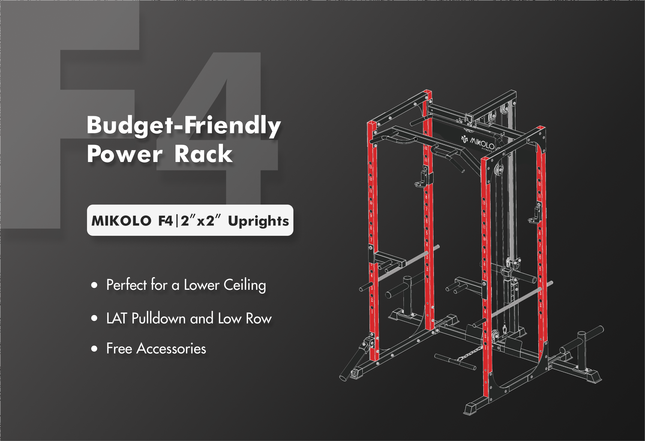 The F4 isn't just a power rack. It is a 1:1 pulley ratio cable system integrated with a lat pulldown machine and a low-row attachment. With other accessories, that Multi-Grip Pull-Up Bar, (4) Plate Storage Posts, (2) Accessory Storage Hooks, Heavy-Duty Solid Steel Safety Spotter Pins, Wide & Narrow Grips Dip Handles, (2) J-Hook, (2) Safety Weight Catch, (2) Barbell Holder as well as (4) Weight Plate Storage. Also come with three cable attachment: Lat Bar, Cable Bar, Tricep Rope