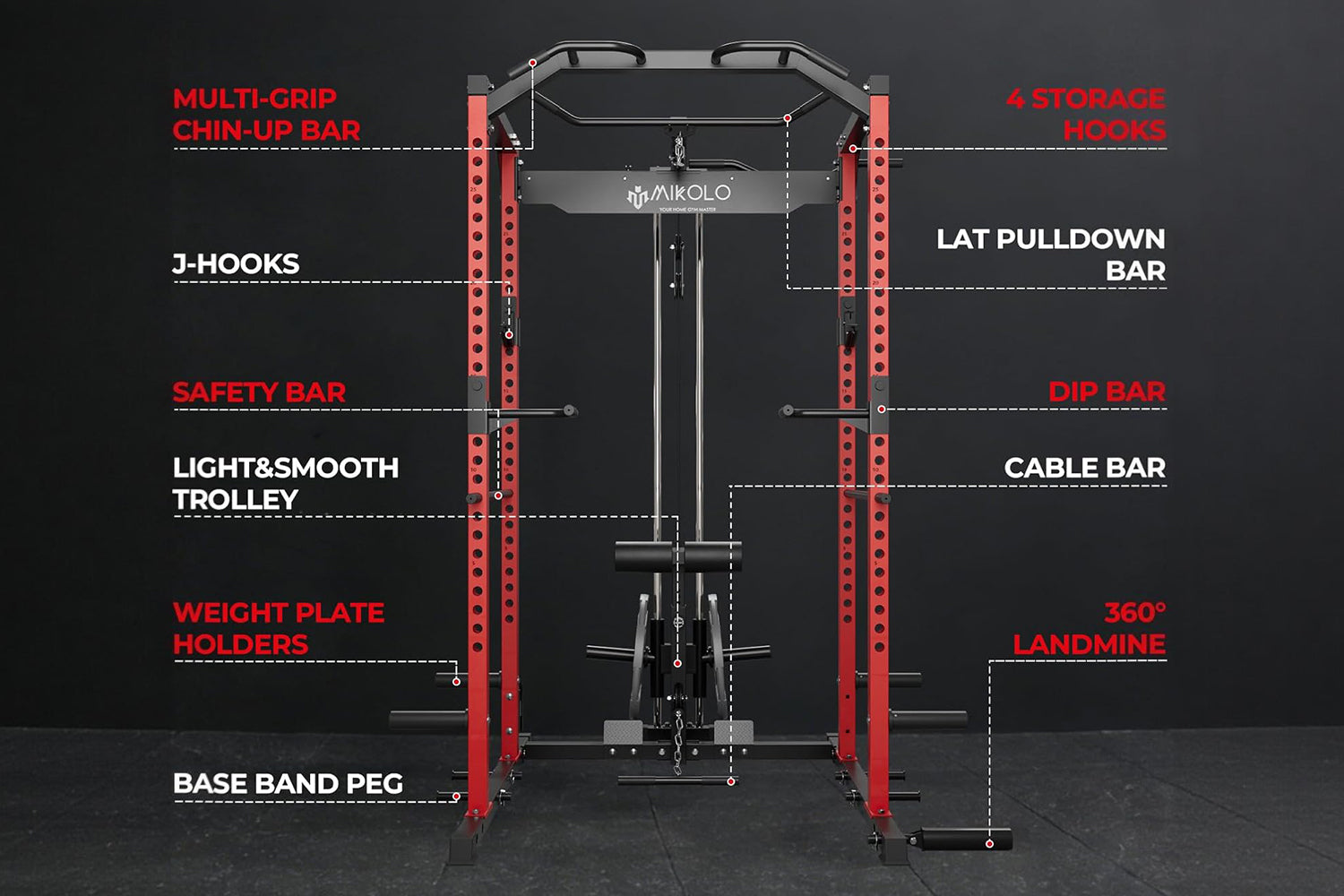 This all-in-one power cage combines a power squat rack, cable row, dip station, power tower, and 360° landmine into a single compact footprint—just 61.2" wide x 59.9" deep. It comes fully equipped with a lat bar, cable handles, T-bar, and J-cups so you can squat, press, row, pull, and hinge without adding extra machines or eating up more floor space.
