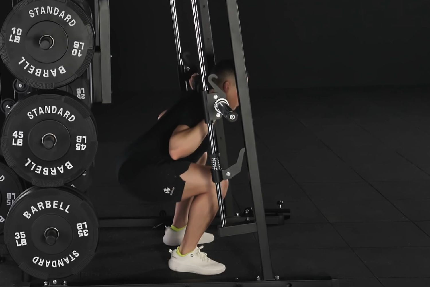 Safety first design: The Smith machine features a guided bar path for controlled movement and 14 lift-off and racking positions for versatility and safety. Heavy-duty J-hooks and 20-inch-long safety catches ensure you can confidently perform squats, bench presses, and other barbell exercises.