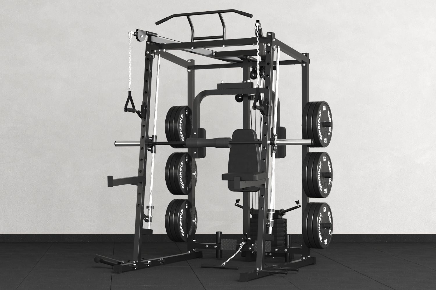 Get a total gym out of one efficient piece of exercise equipment includes 7° angle Smith Machine, Olympic Smith Bar with sealed linear bearings, Pec deck station, High cable crossovers and Low pulley with a foot rest in one space-saving design.