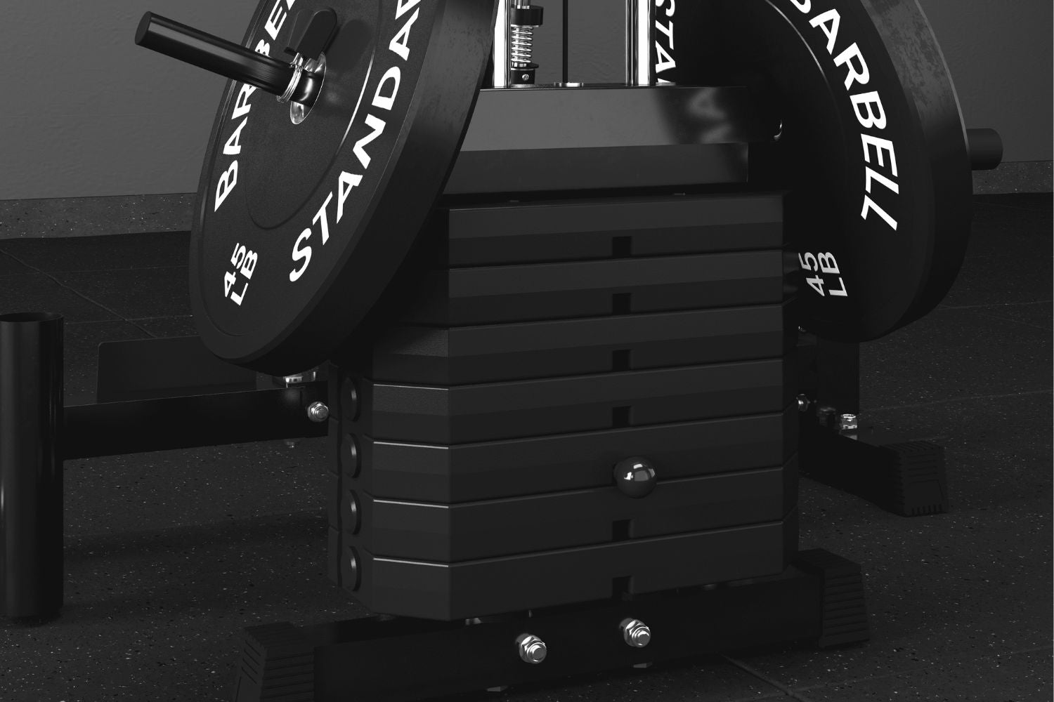 120 LBS Selectorized weight stack: With a built-in stack of weights and a sleek pin to adjust your load in seconds, there's no need to drag out plates or swap them mid-workout. Just pull the pin, slide it in, and boom—you’re ready to go. While weight stack systems typically have a max weight limit determined by the built-in stack, if you're a lifter who enjoys pushing your boundaries, you might find the weight capacity a little limiting. That's where the special add-on weight plate posts come in to help.